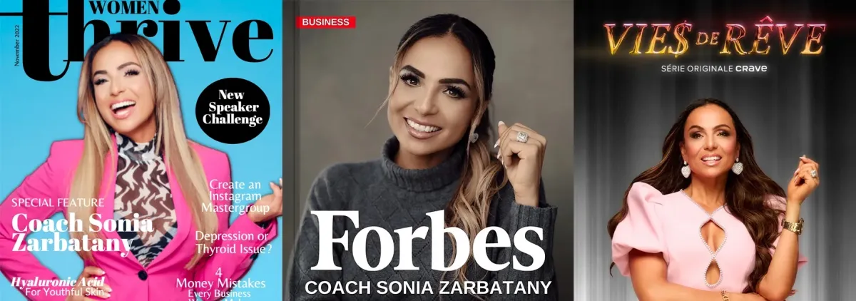 Coach Sonia - Sonia Zarbatany est une coach d’élite, entrepreneure à succès et conférencière internationale qui incarne la nouvelle génération de leaders alliant business, branding et impact réel. Reconnue comme l’une des personnalités québécoises les plus influentes, en vedette dans l’émission Vie de Rêves, diffusée sur la plateforme Crave.